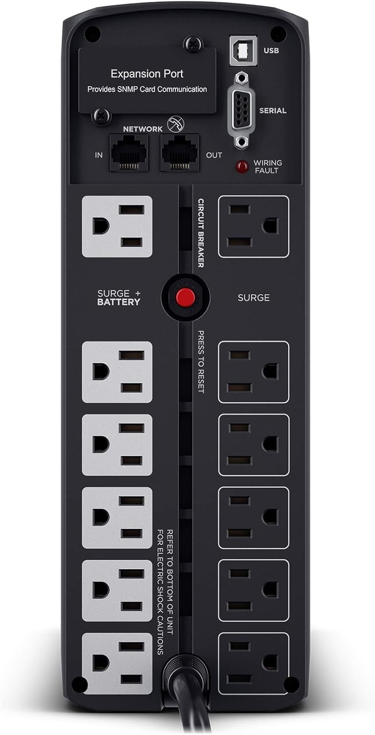 • 12 NEMA 5-15R OUTLETS: Six battery backup & surge protected outlets, six surge protected outlets; INPUT: NEMA 5-15P right angle, 45 degree offset plug with five foot power cord; 2 USB charge ports (1 Type-A, 1 Type-C) quickly charges mobile phones and tablets