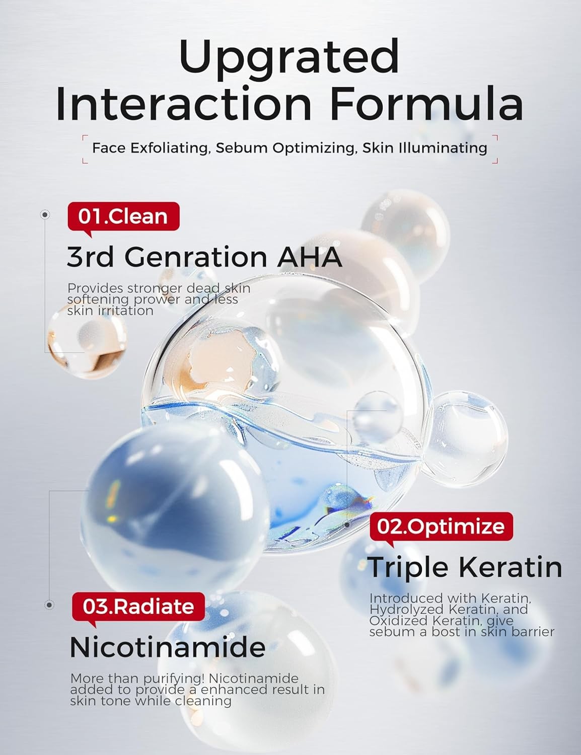 • GENTLE YET EFFECTIVE FACE EXFOLIATOR: NING DERMOLOGIE Peeling Gel combines AHA & PHA for a balanced exfoliation. AHA high-effectively dissolve dead skin cells, unclogs pores, and accelerates skin renewal, while PHA, a third-generation fruit acid, provides more gentle exfoliation, deep hydration, and antioxidant protection, improving skin texture. With continued use, pores appear more refined, and skin feels clean and refreshed without dryness or tightness.
