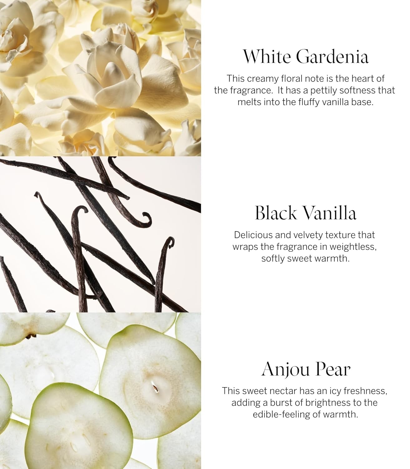 • Scent Notes: white gardenia, Anjou pear, black vanilla