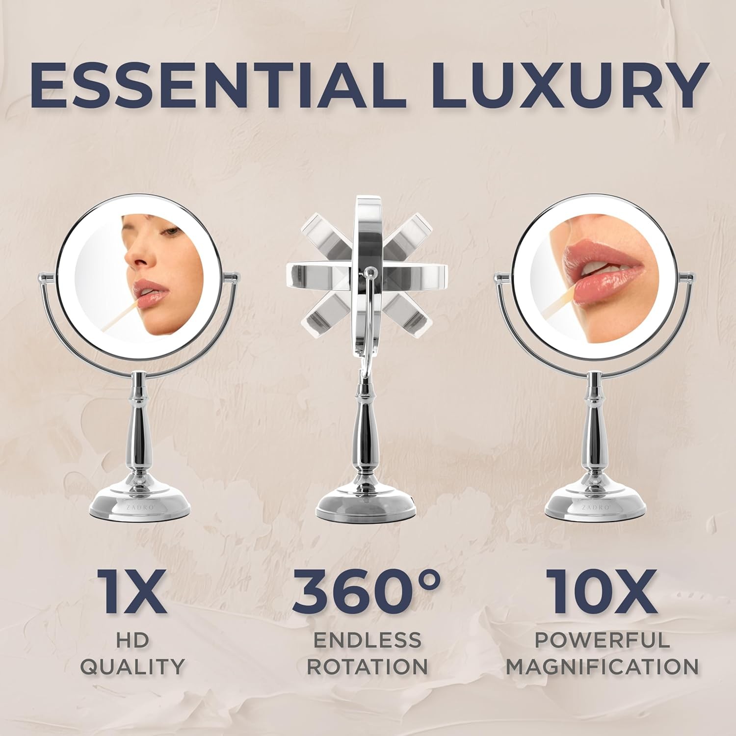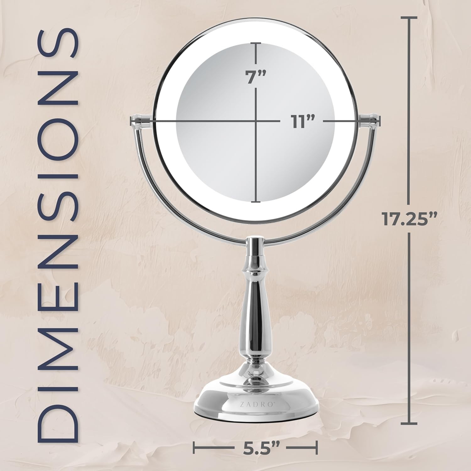 • DIMENSIONS - This Zadro LED lighted makeup mirror, thoughtfully designed with an adjustable touch base, stands at an elegant 17 inches tall and 11 inches wide, providing a compact yet spacious frame, while its 7-inch reflective mirror offers a perfectly balanced viewing area, allowing for a crystal-clear, enhanced reflection that is ideal for all your makeup, grooming, and beauty routines, all with the added convenience of customizable lighting and touch-sensitive controls for a personalized experience.